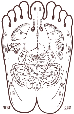 Chaque partie du pied est en relation, par l’intermédiaire du système nerveux, avec les organes du corps, si bien qu’une stimulation d’un point réflexe du pied entraîne la stimulation de l’organe correspondant.